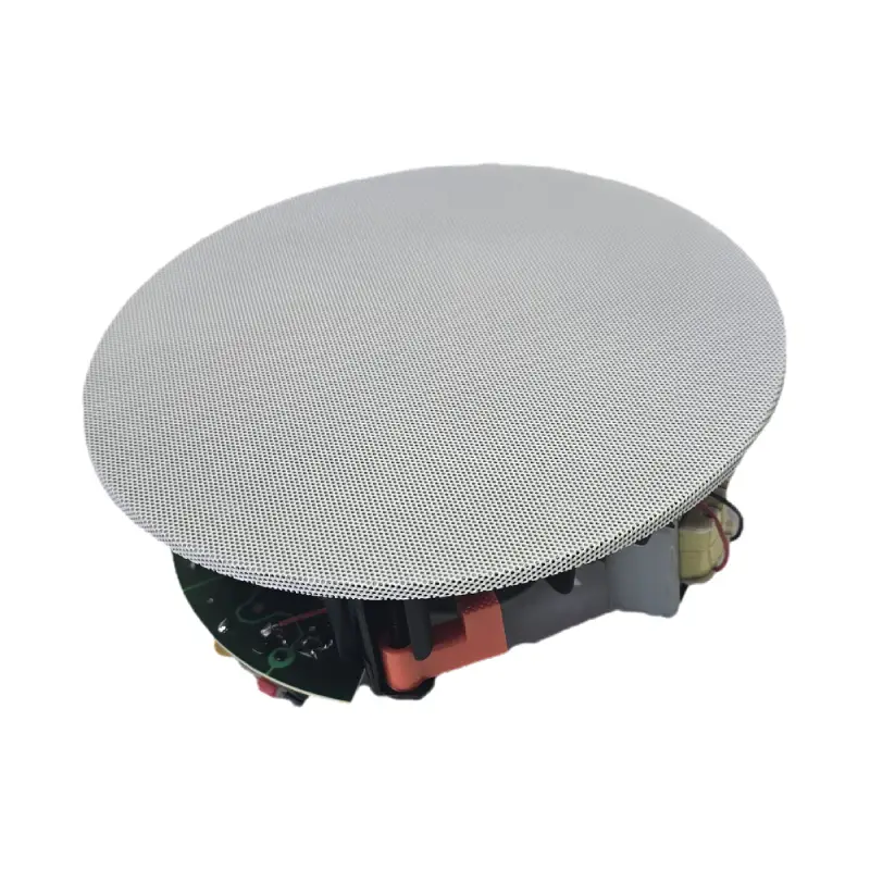 بدنه بدون فریم و توری آهنربایی این اسپیکر، ظاهری کاملاً یکدست و مینیمال ایجاد میکند که پس از نصب، به زیبایی در سقف ادغام میشود.